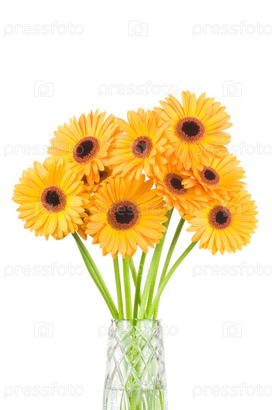 Желтые герберы в вазе на белом фоне