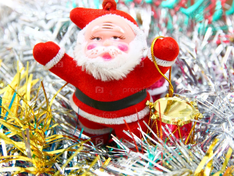 Фигурка Деда Мороза с красным барабаном на фоне мишуры