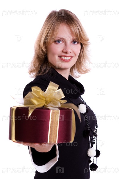Молодая улыбающаяся девушка с подарком в руках на белом фоне