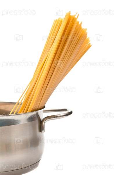 Крупным планом спагетти в кастрюле на белом фоне
