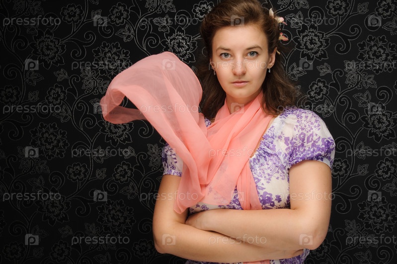 Красивая женщина с развевающимся шарфиком на темном фоне