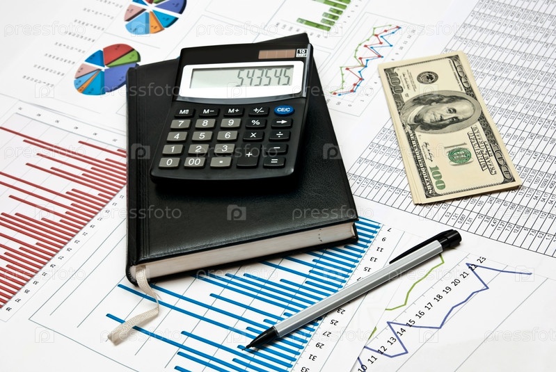 Калькулятор, деньги и блокнот на фоне финансовых диаграмм