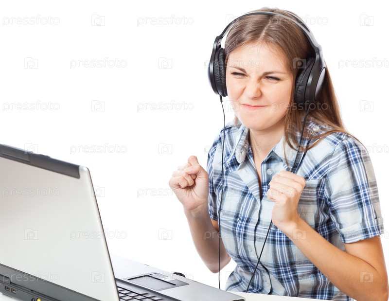 Девушка слушает музыку в наушниках, сидя за своим компьютером