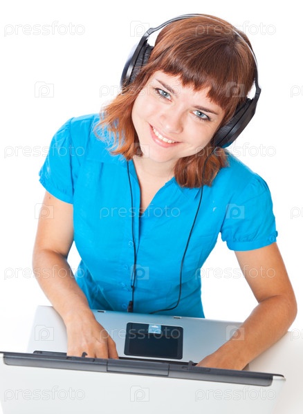 Рыжая девушка слушает музыку в наушниках с ноутбуком