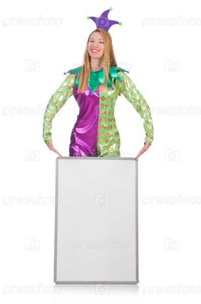 Клоун с пустым баннером на белом фоне