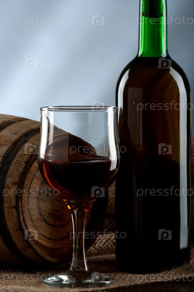 Бочонок, бокал и бутылка с вином