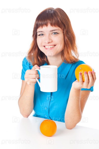 Улыбчивая девушка с чашкой кофе и двумя апельсинами на белом фоне