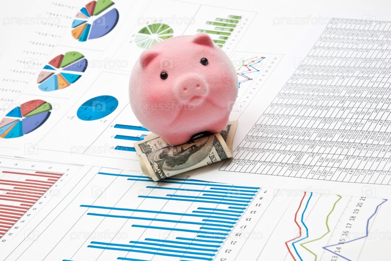 Копилка и деньги на фоне бизнес-диаграмм