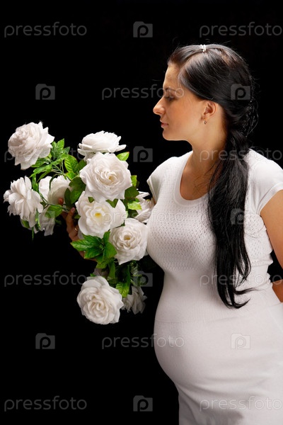Красивая беременная женщина с букетом белых роз на черном фоне