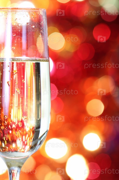 Бокал шампанского на рождественском, разноцветном фоне