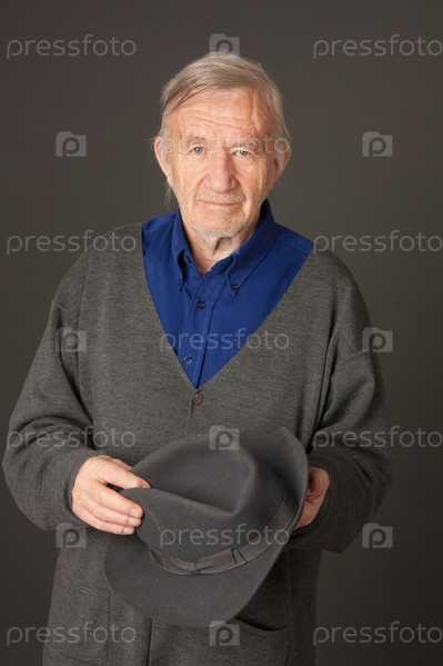 Пожилой мужчина в сером кардигане держит в руках шляпу
