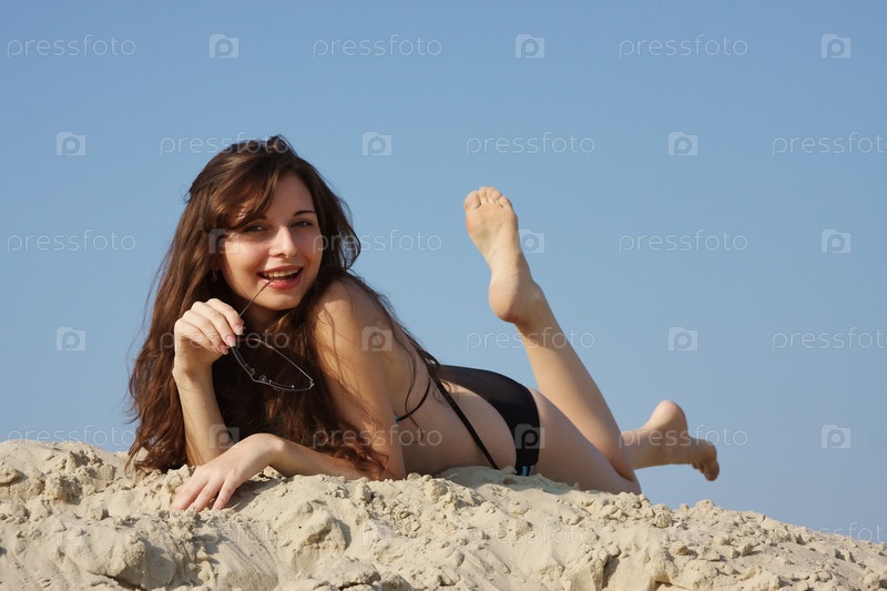 Девушка в купальнике лежит на песке на фоне неба