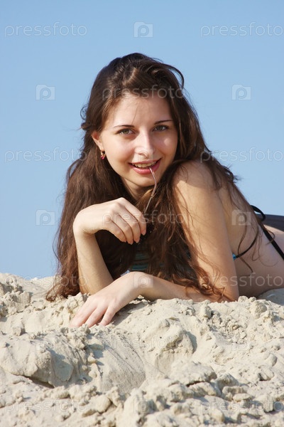 Девушка в купальнике лежит на песке на фоне неба