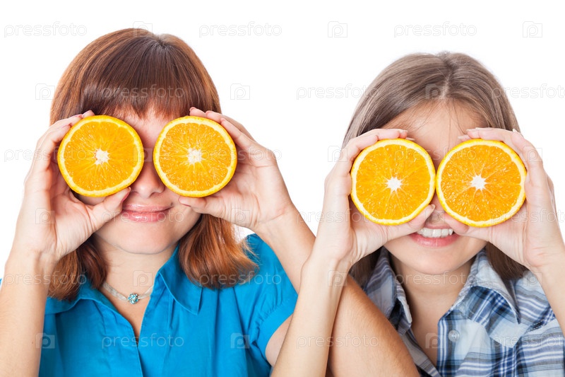 Две девочки смотрят через половинки апельсинов. Изолированы на белом фоне
