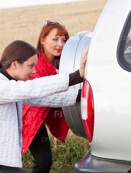Две женщины толкают автомобиль в поле