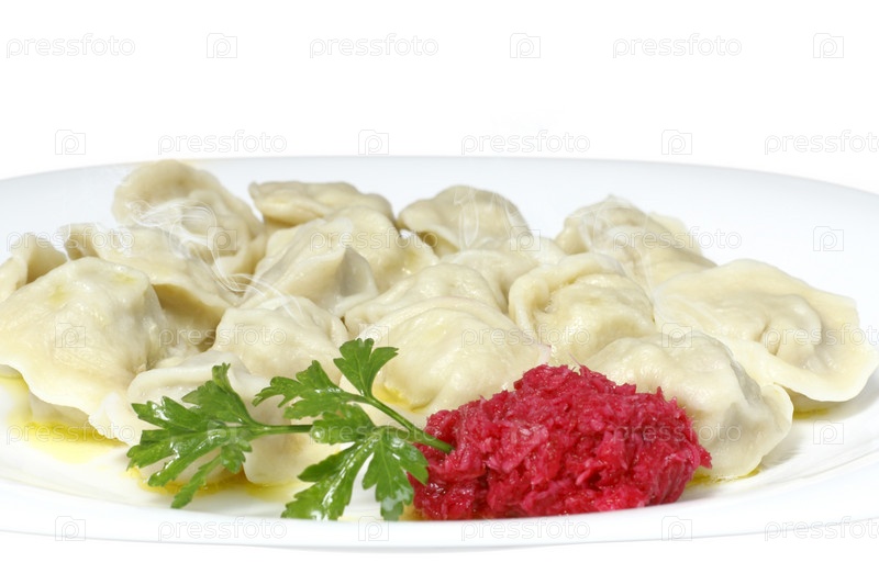 Вареные пельмени ручной работы на белом фоне