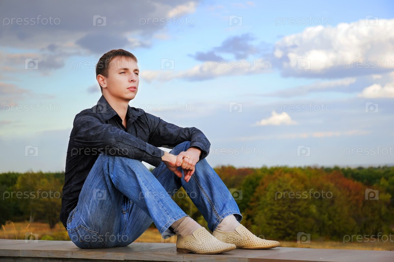 Задумчивый молодой человек на фоне леса и неба