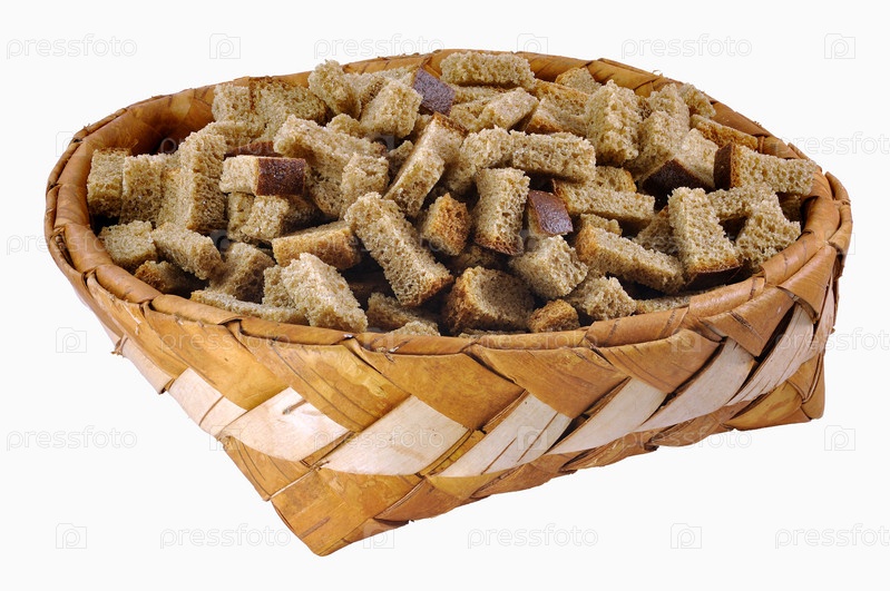 Домашние сухарики в берестяной корзинке на белом фоне