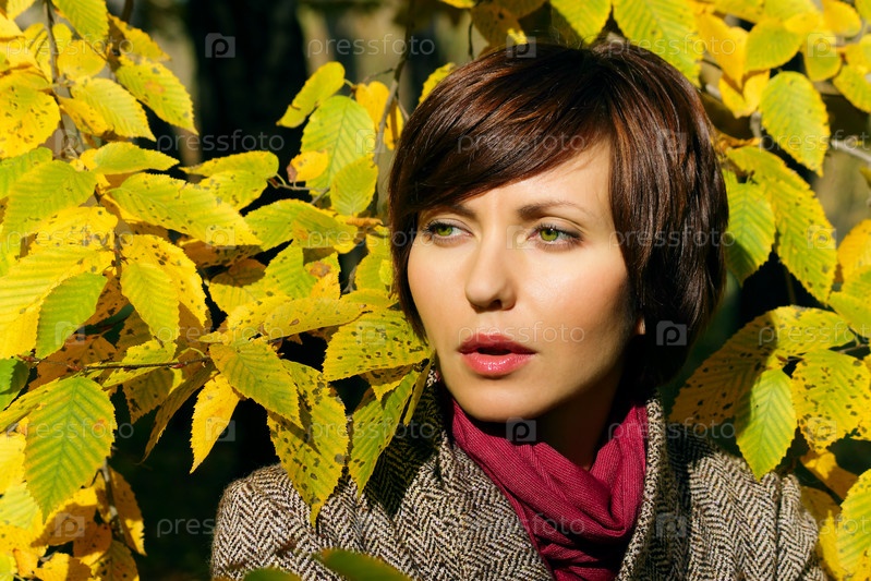 Портрет молодой девушки на фоне осенних листьев