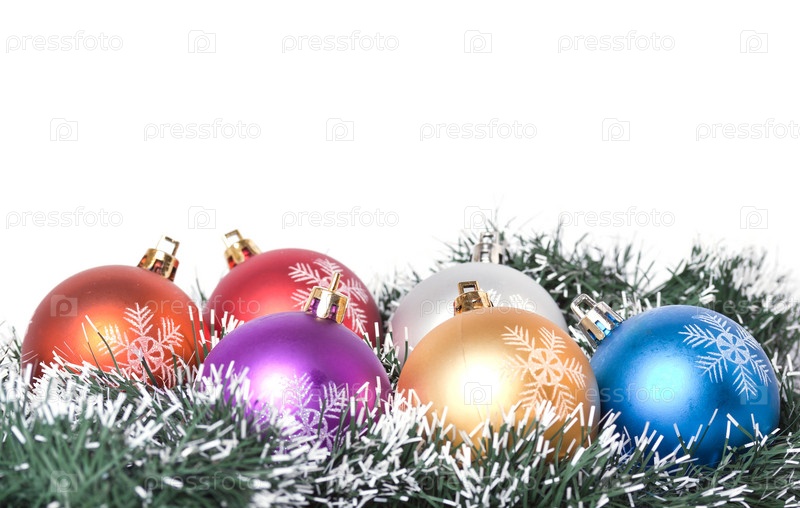 Новогодние разноцветные шары и гирлянда на белом фоне
