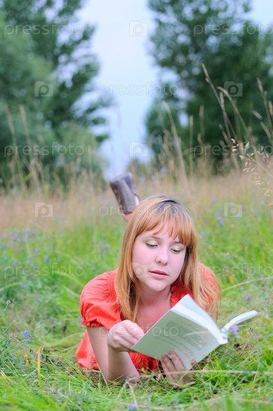 Молодая женщина лежит на траве и читает книгу