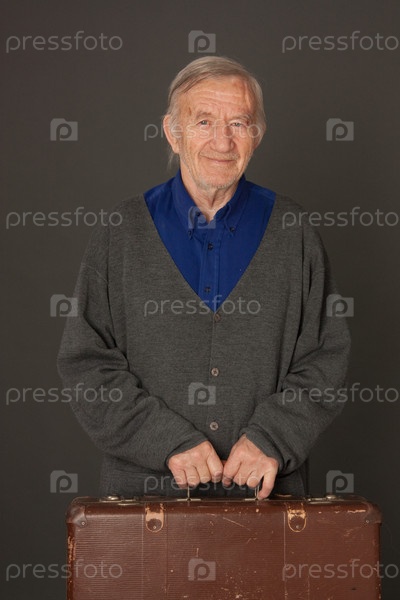 Пожилой мужчина с чемоданом на темном фоне