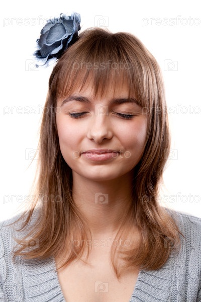 Девушка с заколкой-цветком на голове, закрывшая глаза, изолированная на белом фоне