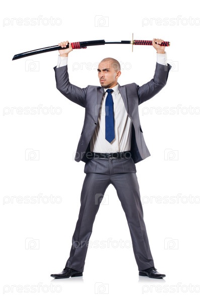 Бизнесмен с мечом, изолированный на белом фоне