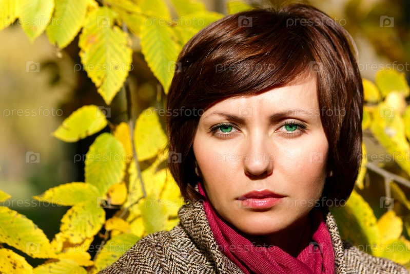 Портрет зеленоглазой брюнетки на фоне листвы