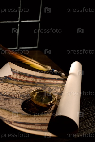 Карта, компас и перо на черном фоне