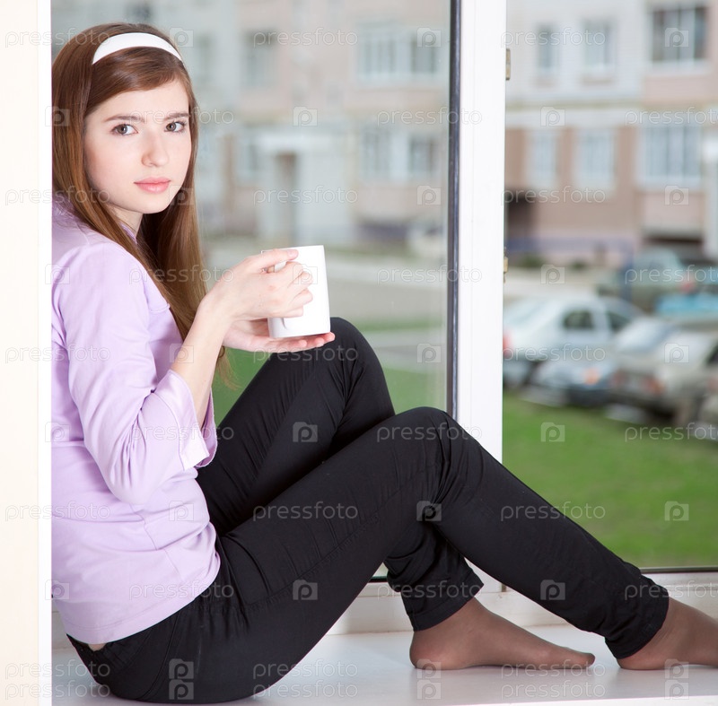 Девушка с кружкой сидит у окна