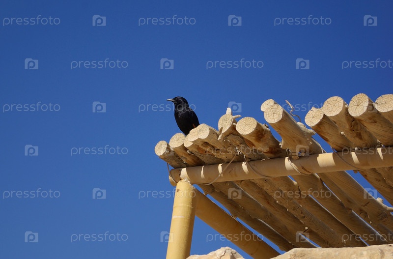 Черная птица на деревянной крыше в крепости Масада