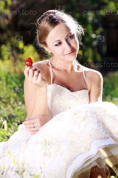 Молодая девушка, сидящая на траве с клубничкой в руке
