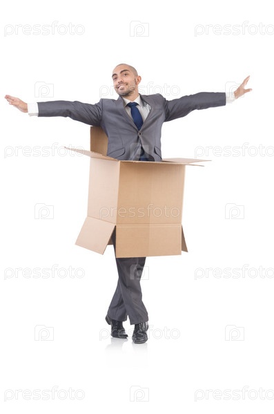 Бизнесмен с коробками, изолированный на белом фоне