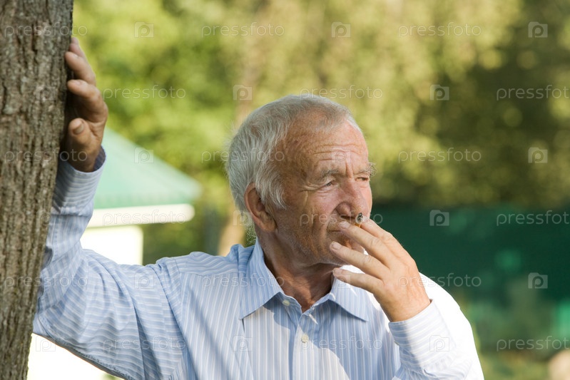 Пожилой человек курит сигарету, опираясь на ствол дерева
