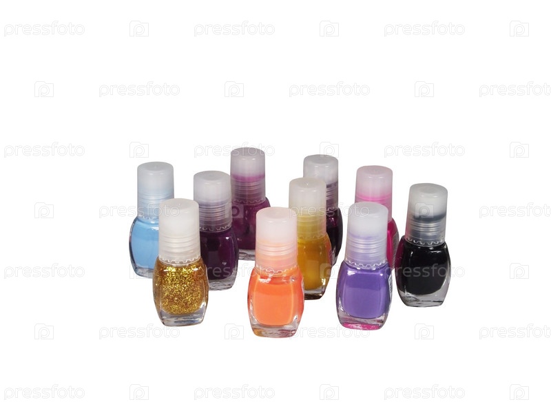 Десять бутылочек лака разных цветов на белом фоне