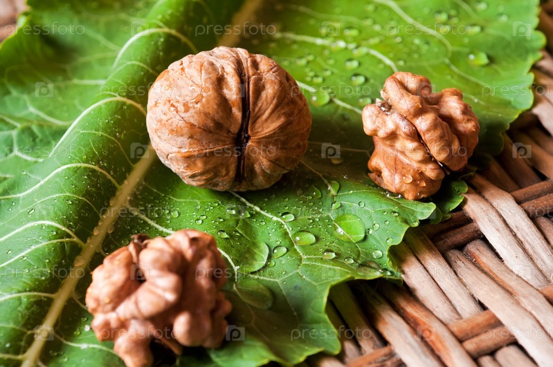 Грецкие орехи на листе с каплями воды