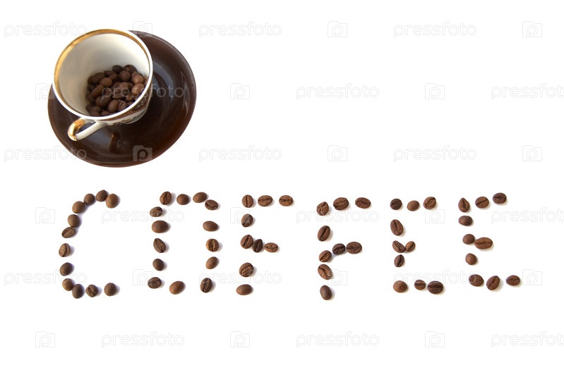 Слово кофе, выложенное кофейными зернами, и чашка с блюдцем