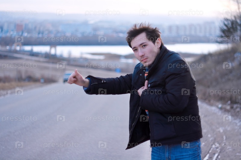 Молодой человек автостопом едет на машине по дороге