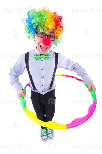 Забавный клоун с обручем на белом фоне