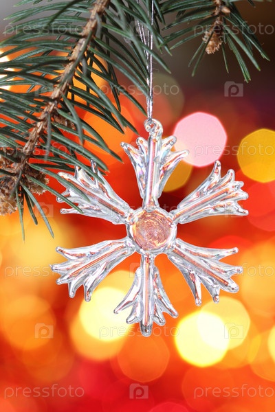 Игрушечная снежинка крупным планом на елочной ветке с красным размытым фоном