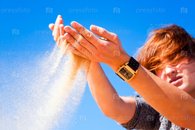 Песок, текущий сквозь пальцы молодой девушки