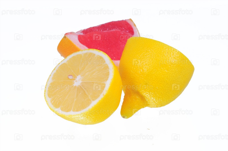 Разрезанный пополам лимон и дольки грейпфрута, изолированные на белом фоне