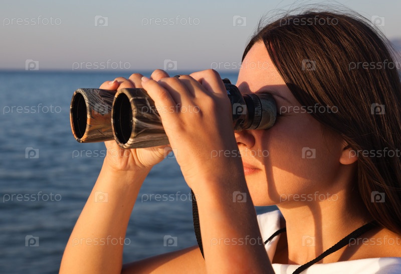 Девушка на фоне моря, смотрящая в бинокль