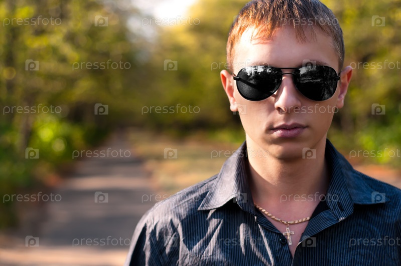 Портрет молодого человека на фоне природы в темных солнцезащитных очках