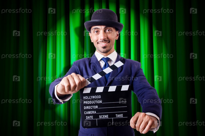 Мужчина с кино-хлопушкой на фоне занавеса