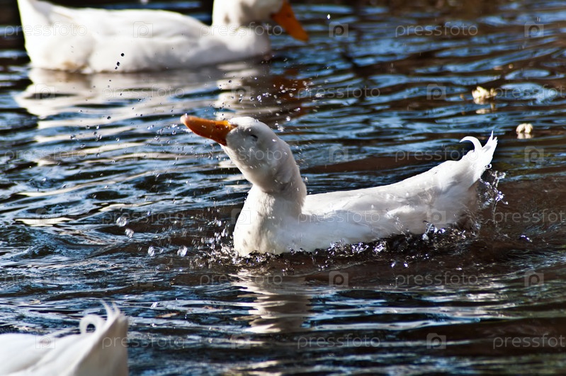 Белая утка плещется в воде