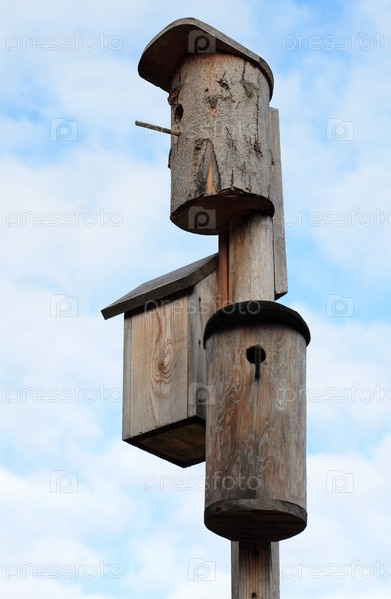 Три скворечника на столбе на фоне неба