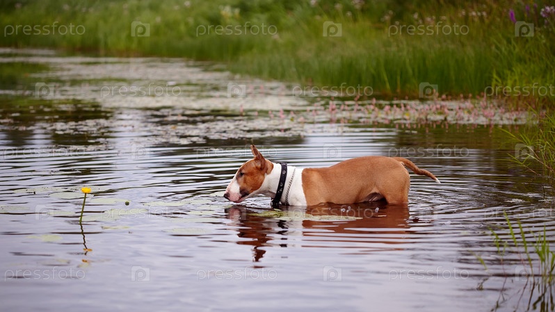 Рыжий английский бультерьер в озере с цветком