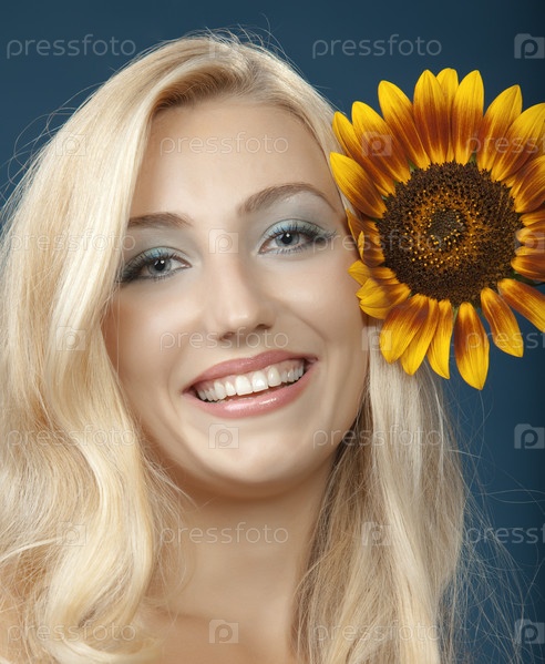 Портрет молодой девушки с цветком подсолнуха в волосах на темном фоне